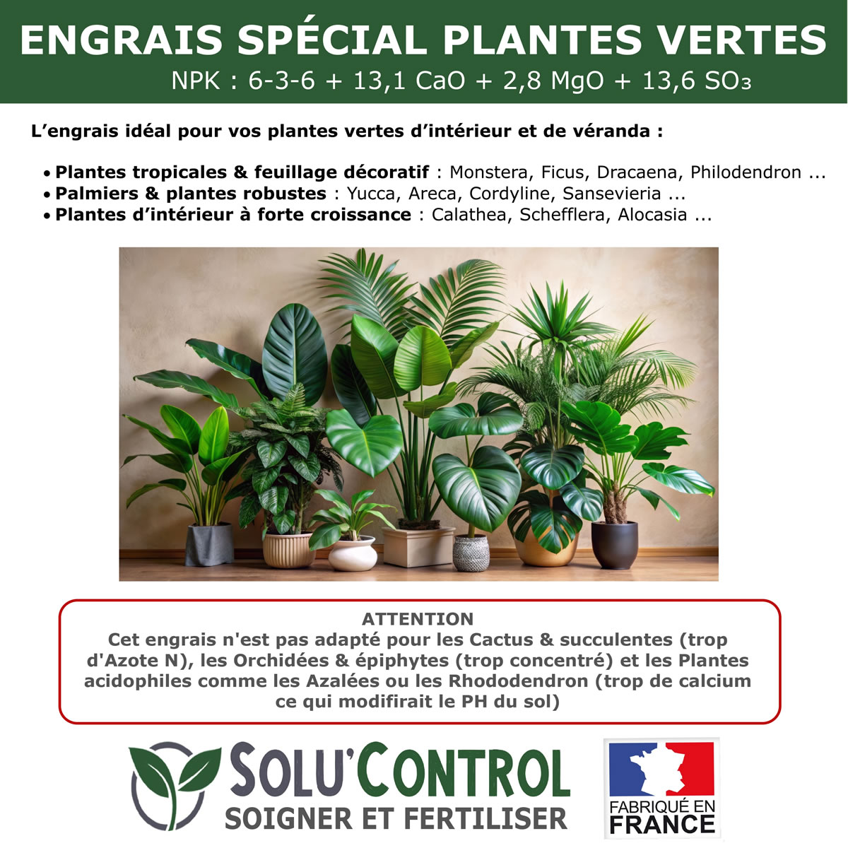 Solu’Control Spécial Plantes Vertes 6-3-6 est un engrais organo-minéral conçu pour stimuler la croissance harmonieuse et la beauté du feuillage des plantes d’intérieur et d’extérieur comme Monstera, Ficus, Dracaena, Pothos, Yucca, Areca, Calathea, Philodendron ou Schefflera.